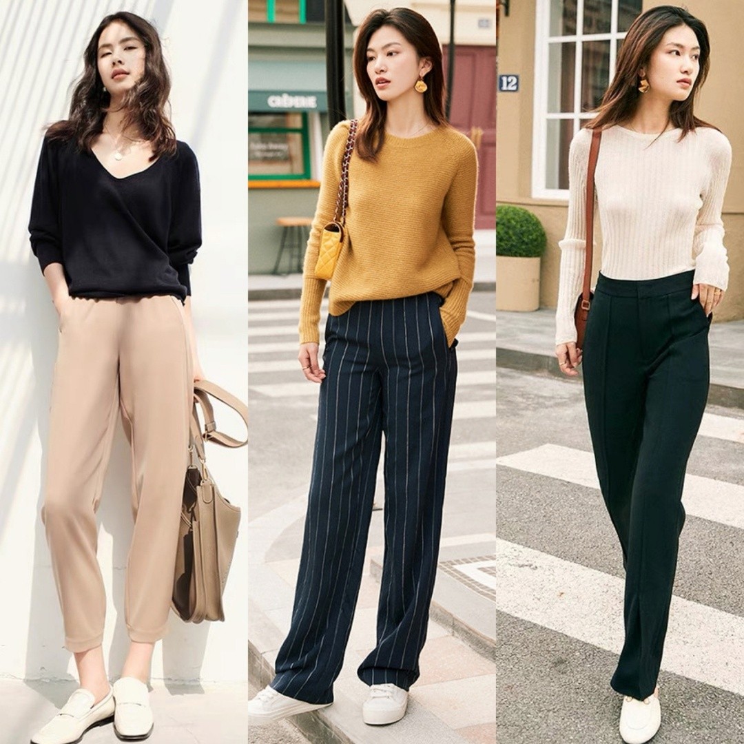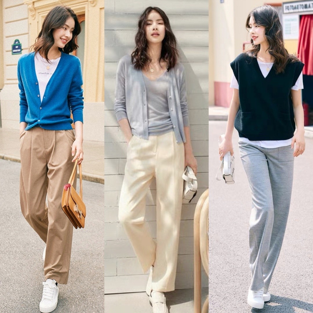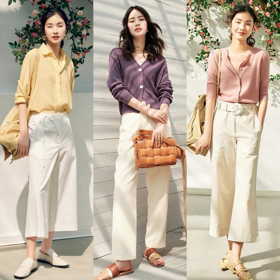 雖然很多人會擔心這種白色的褲子沒有黑色的顯瘦,但只要你選擇稍微寬鬆一些的版型,再結合九分的長度,那麼大部分人都可以駕馭。