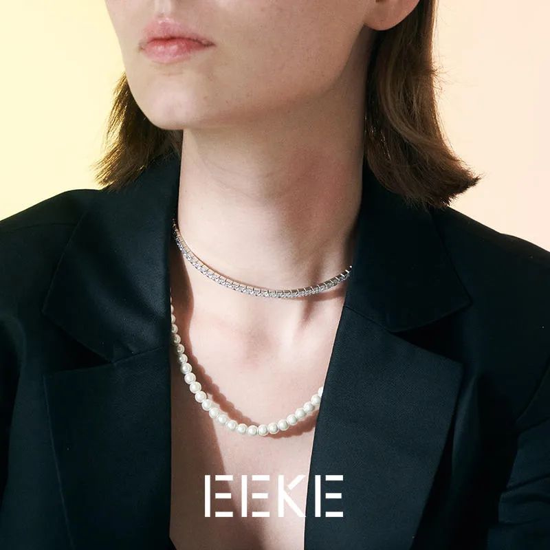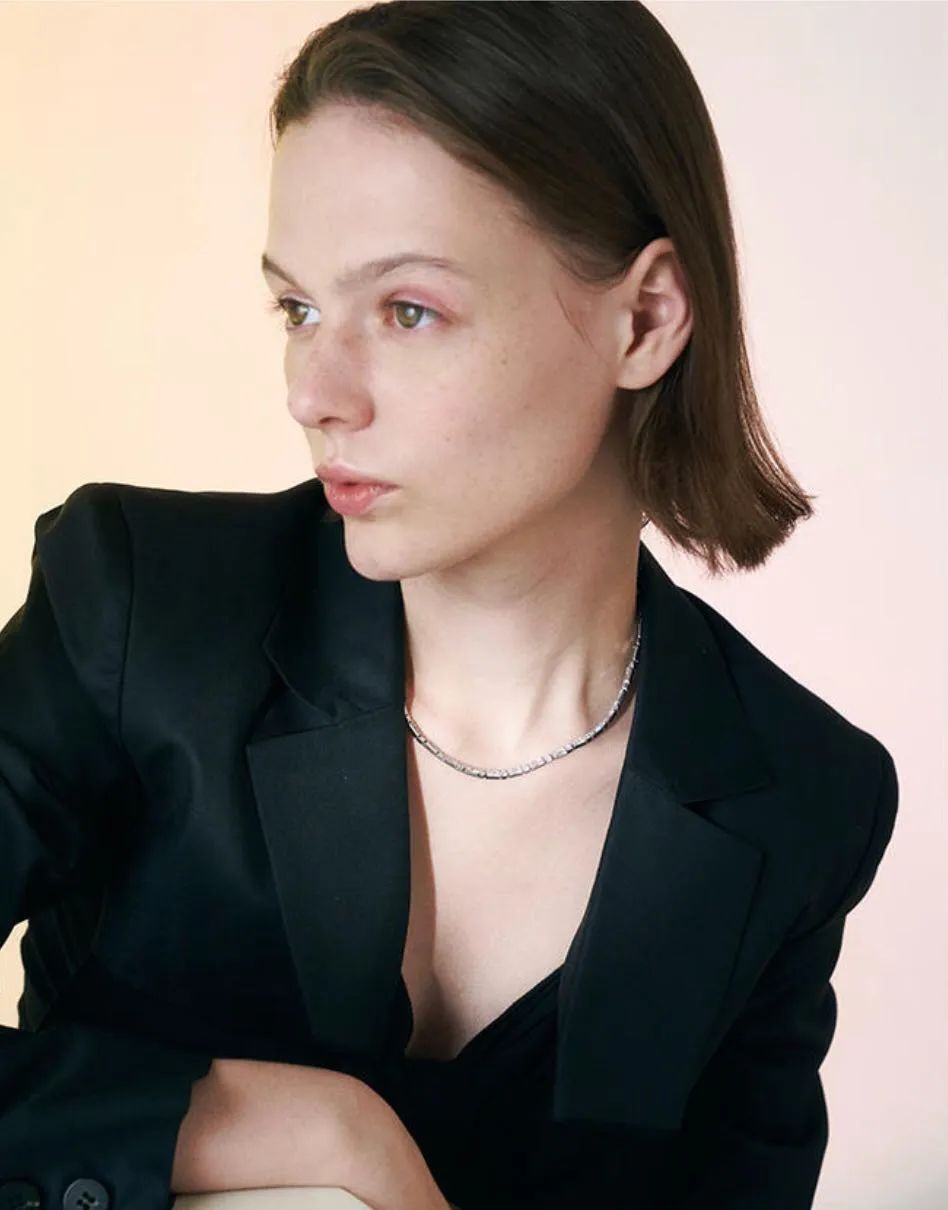 這條項鏈「一體兩面」,包括晶鑽Choker和珍珠項鏈,自動幫你們搭配好了~晶鑽Choker負責閃爍,珍珠負責讓它變得更日常,像這樣與西裝或者V領上衣搭配,它可以成為全身的亮點。