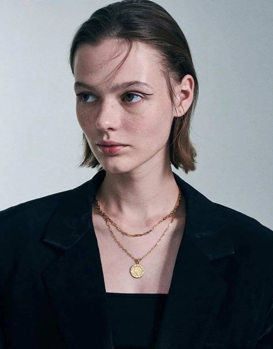 第一條是這個看似很「古老」的金幣項鏈,金幣的「內容」也很實用,是星座符號,結合了十二星座羅盤的設計,點綴一粒晶鑽,經典不失時髦。