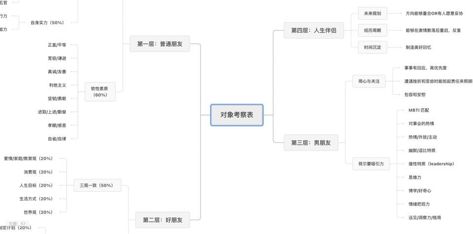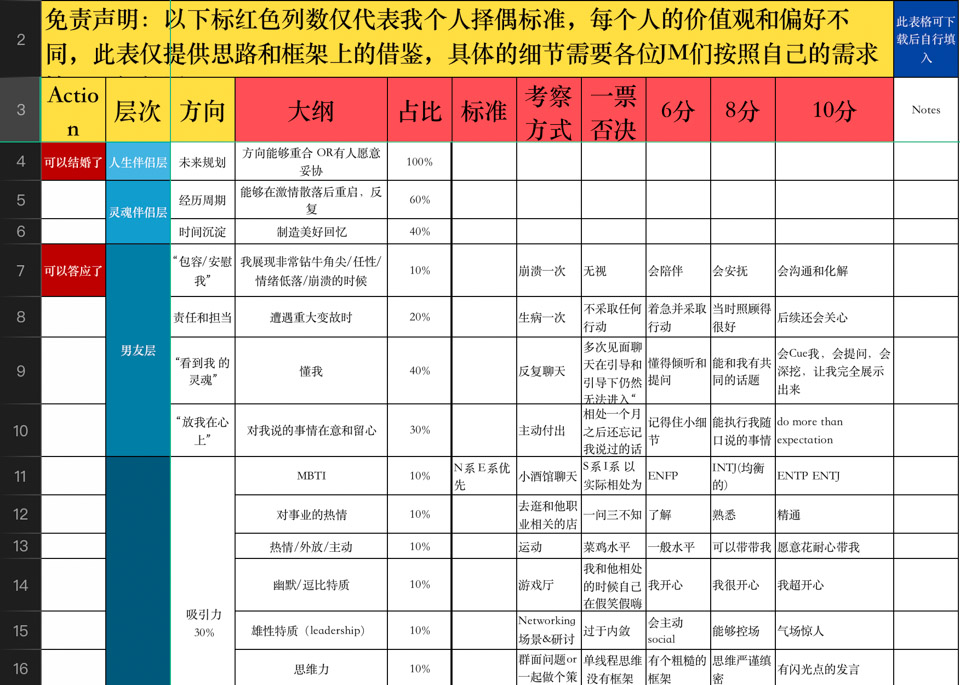 評論中詢問最多的是卡羅蘭總結出的對象考察打分表。卡羅蘭在這張表格中詳細列出了從認識到能夠結婚的不同階段與步驟。大方向上,有普通朋友、好朋友、男朋友、人生伴侶四個階段,每個階段又能拆分出多個不同占比的領域。四個階段的所有細分領域加起來有四十六個,每個領域都列出了相應考察方式,以及一票否決、六分、八分、十分的具體評判標準。