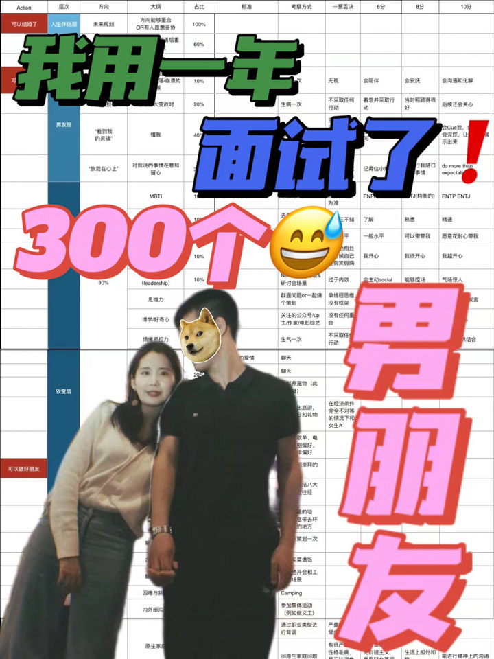 出生於1997年的卡羅蘭在一年「面試」三百個男生並成功找到男朋友之後,將自己的經驗總結成文字,在2022年情人節前一天發布在小紅書上。兩天時間內,這條內容獲得了二十萬閱讀量,過萬點讚數和近五千條評論。