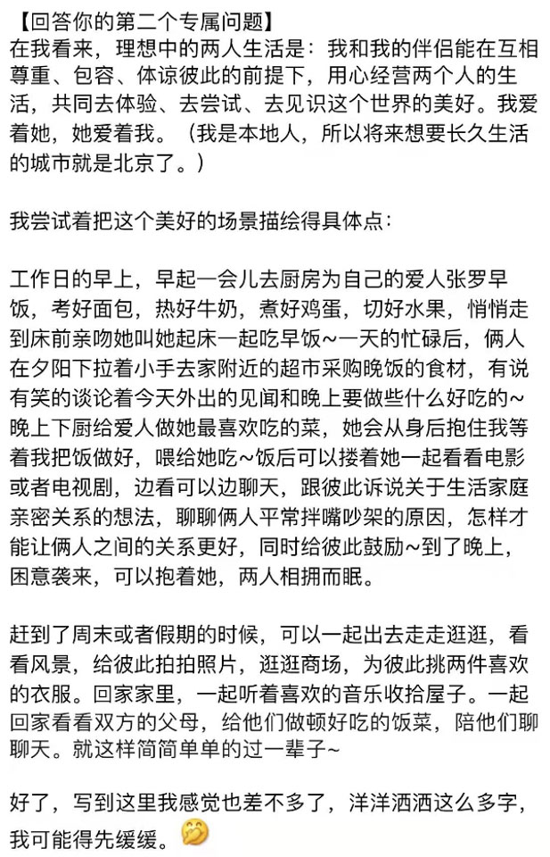 卡羅蘭現在的男朋友是當時線下見的第三個人,兩周的「觀念互問」之後,正式見面之前,兩人基本就認可了對方。在關於未來規劃的互問中,兩人的答案都是在28-30歲左右建立家庭。