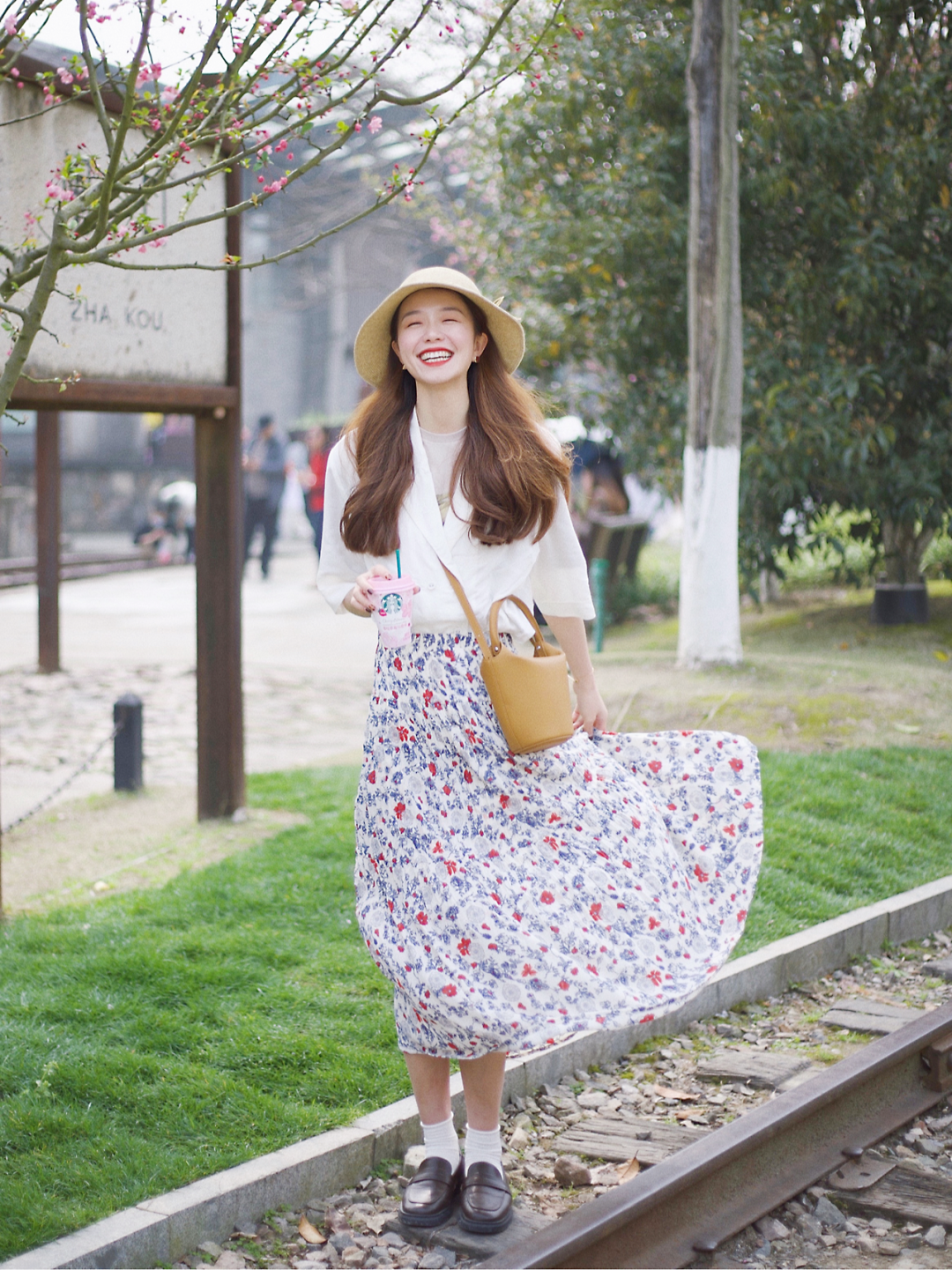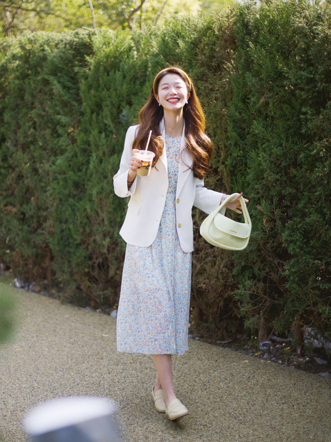 畢竟,太多跳躍的顏色堆砌在身上,容易顯得過分張揚,從而適得其反,讓人視覺感覺很是凌亂和浮躁,所以我們的穿搭小白們,可以選擇簡潔幹練的純白色小西裝內搭小碎花連衣裙,這樣可以保持造型的素雅,又足夠吸睛養眼,可以說是最為保險的穿法。