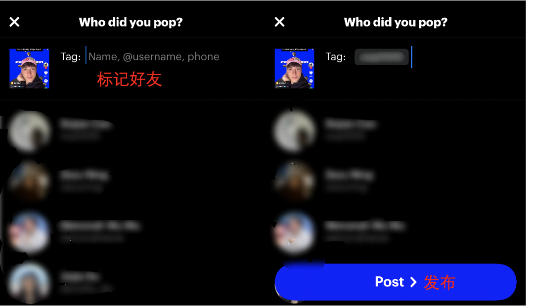 同樣的,作為一款社交 App,其屬性也非常特別,拍好圖片想要發布,還必須標記一位好友,不然發不出去。