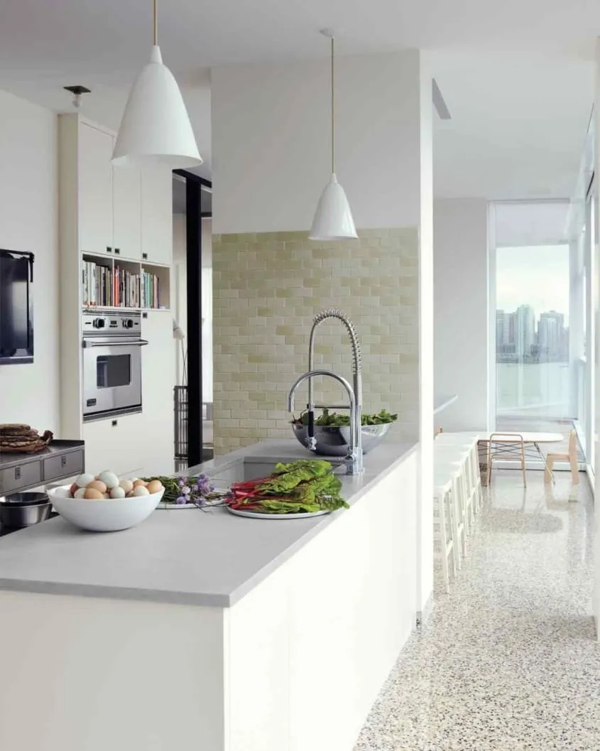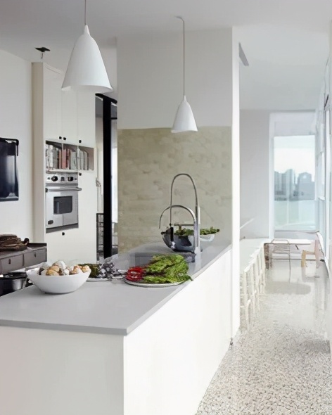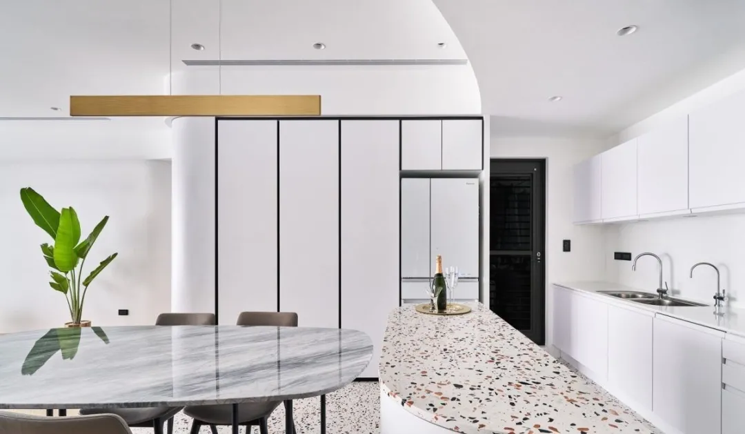 義大利水磨石中島搭配地坪,在白色系空間裡創造視覺焦點。