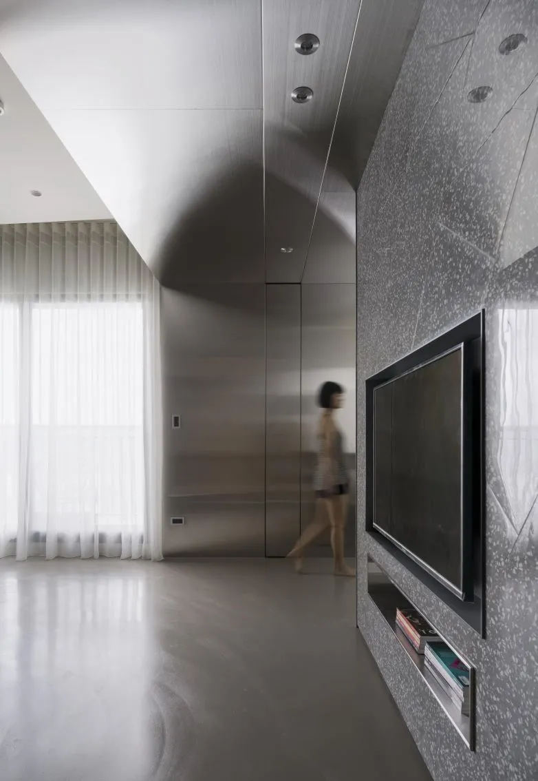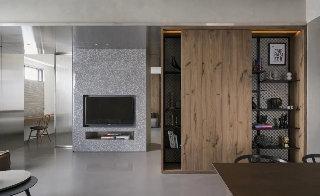 電視主牆利用磨石子磁磚,在水泥質感中揉合了自然石質的感受,並與天花處的大型不銹鋼框架、盤多魔地板相互呼應,透過不同材質展現灰色調的豐富層次。