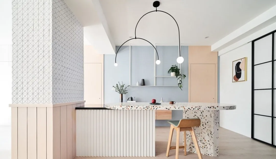 屬於人造石的義大利水磨石中島,能隨居家風格選擇各種花紋配色。