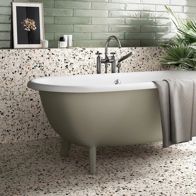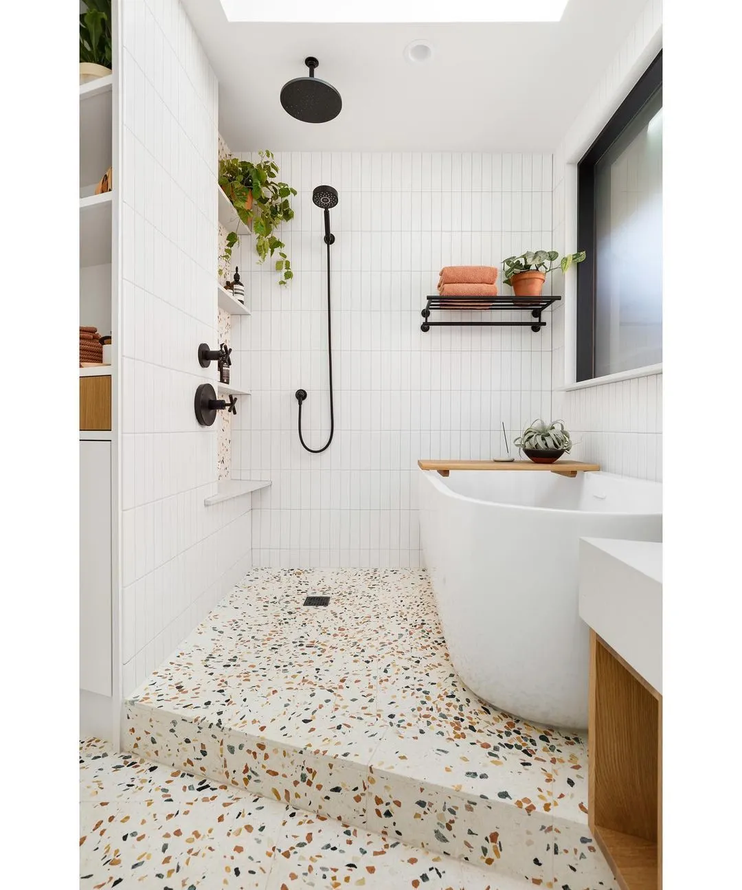 水磨石地面延伸到半牆,均質的花色,讓屋主泡澡時被溫柔包圍。