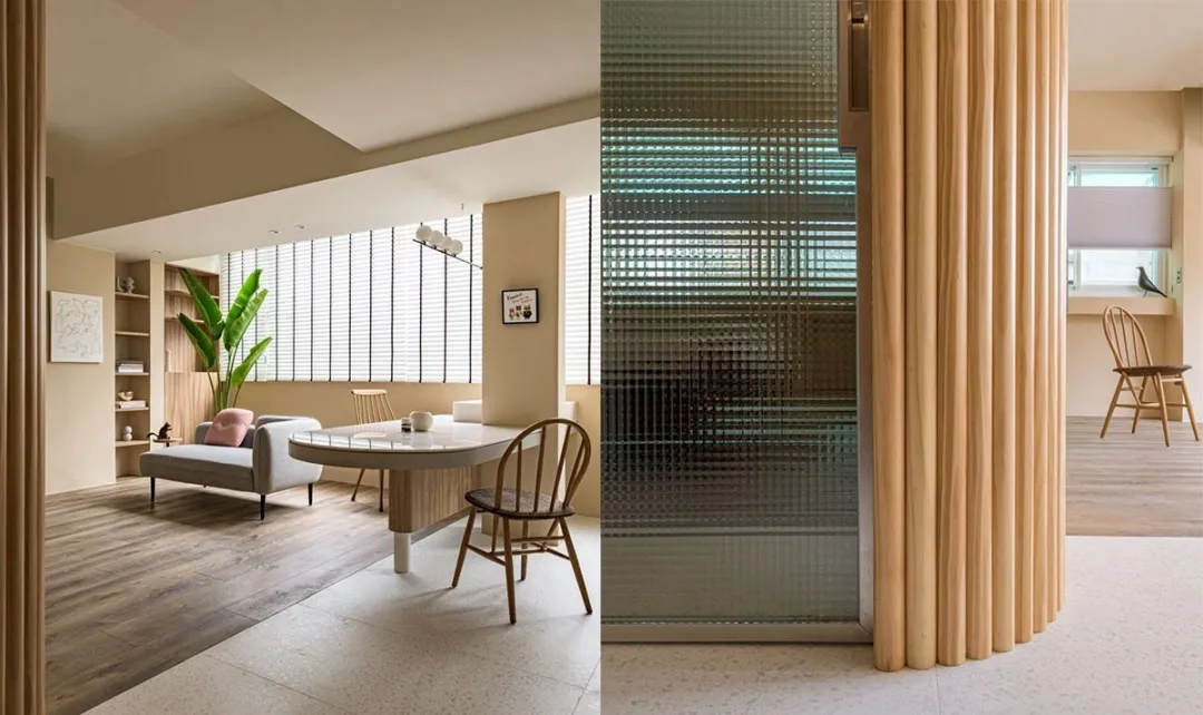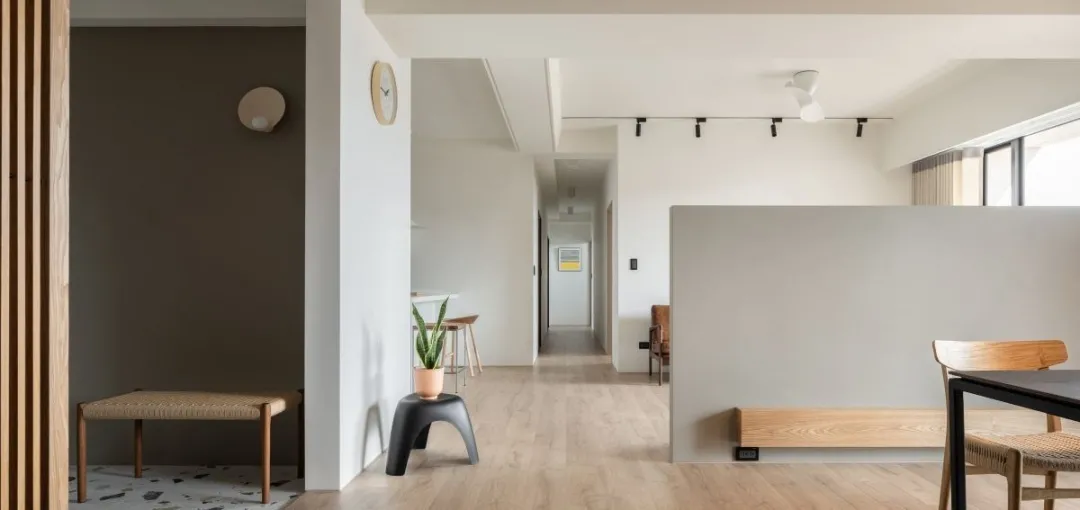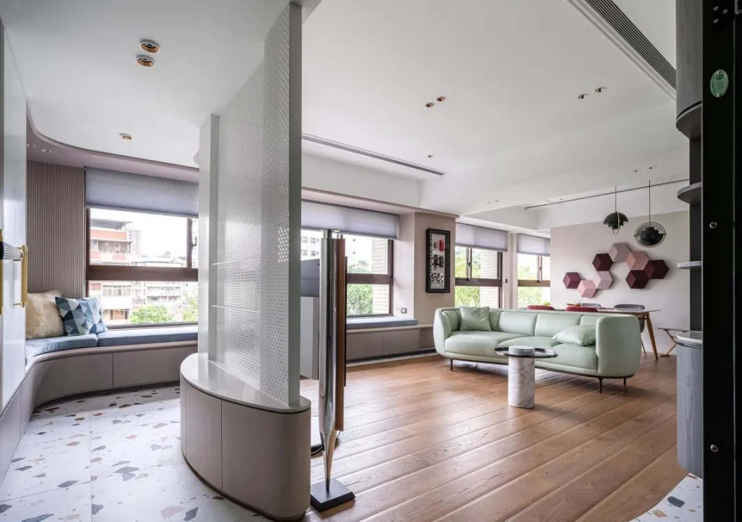 仿義大利水磨石花紋的瓷磚與木地板結合,輕鬆區分落塵區與室內。