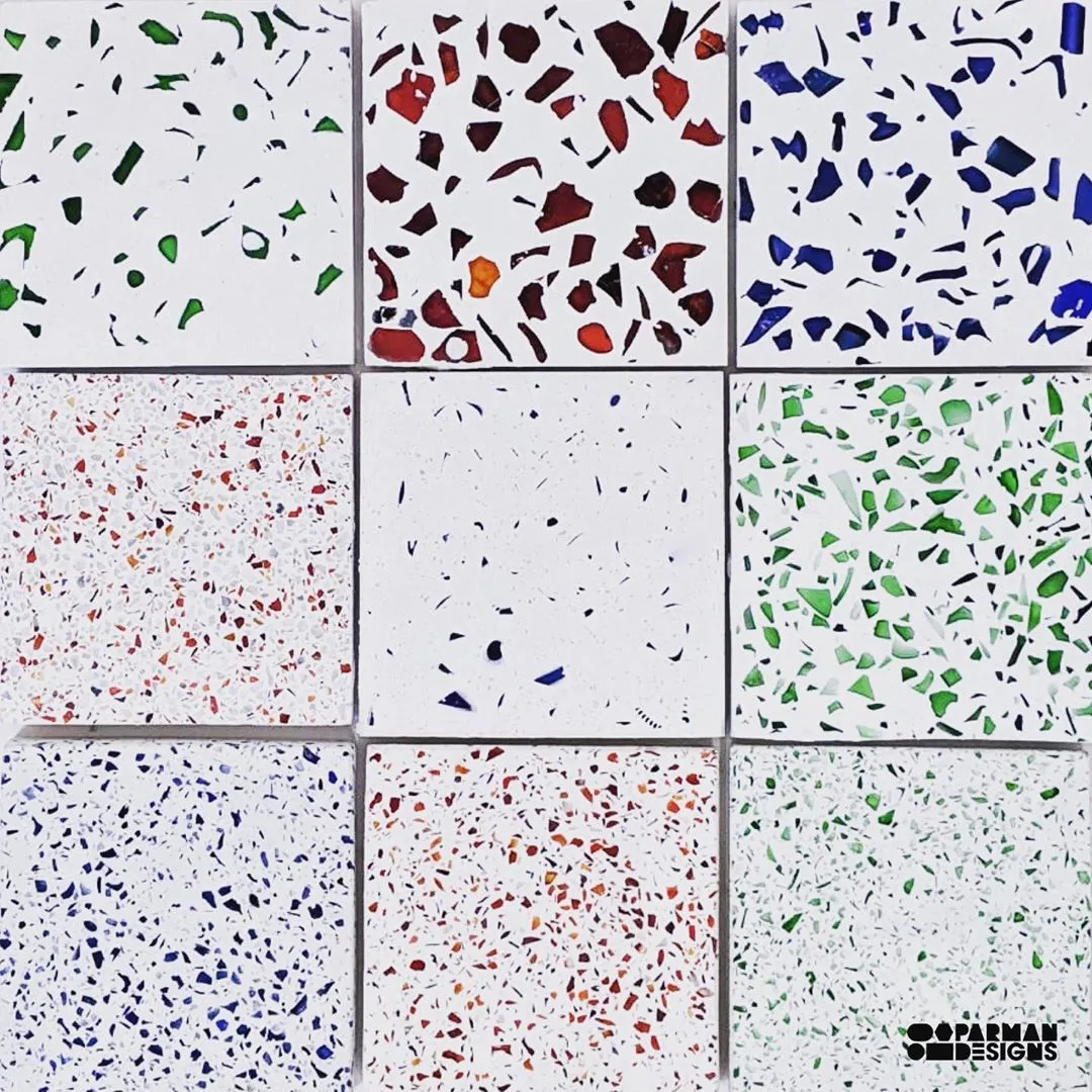 有別於早期會造成污染的傳統磨石子工法,現代多以人造石還原磨石的經典花紋,也有使用瓷磚、陶板瓷磚等等作為實用的裝飾建材。