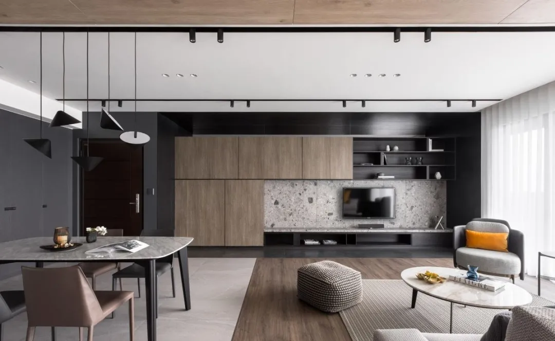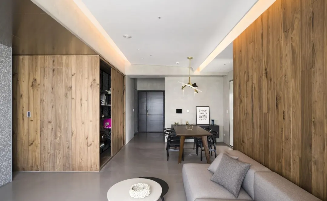 走進空間便有設計酒店般的時尚和舒適度,偏冷的水泥色調和具有溫潤暖度的胡桃木,形成恰到好處的冷暖比例。