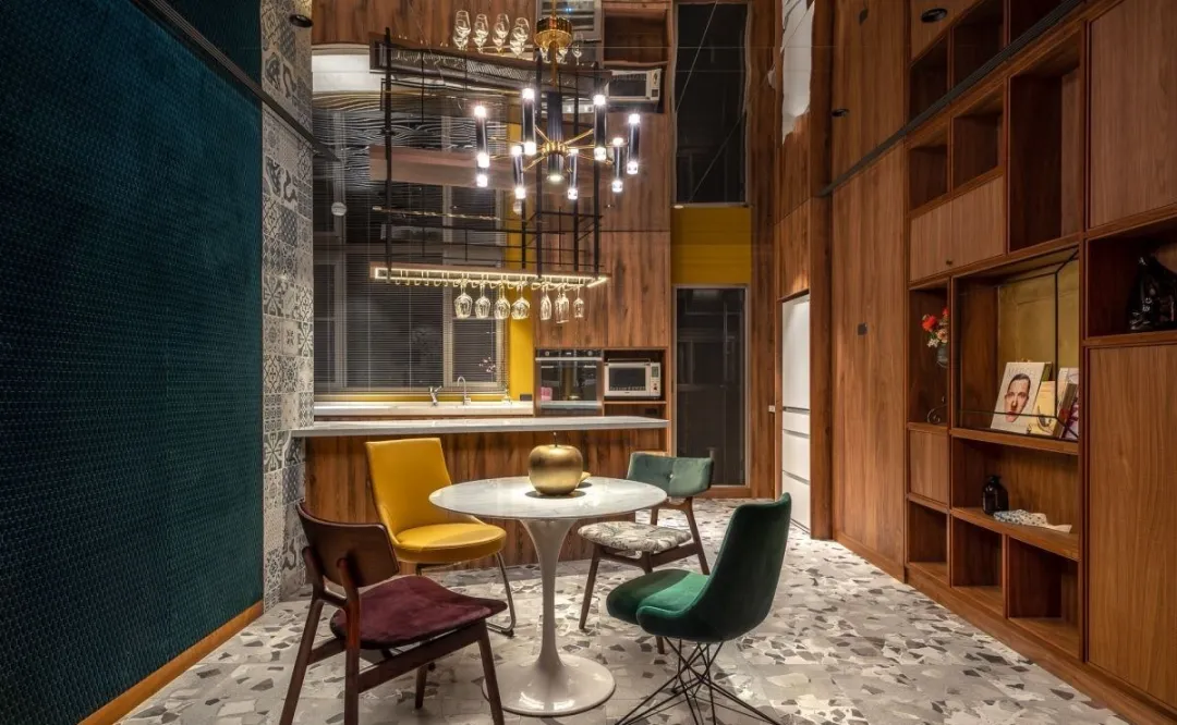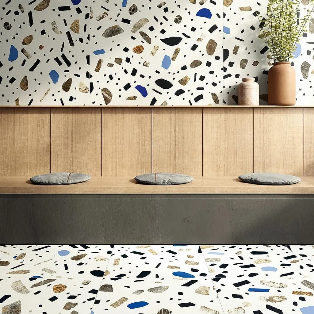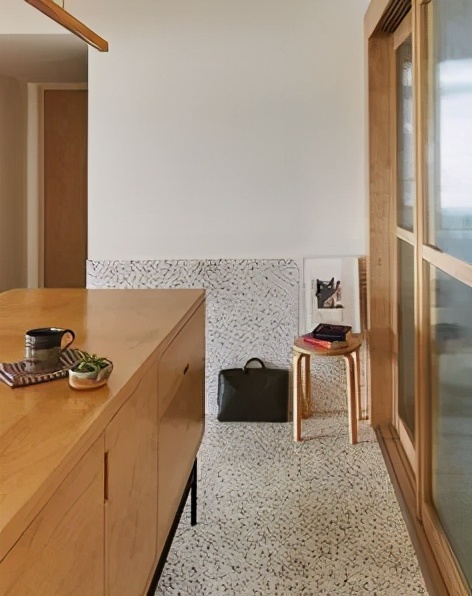 但由於早期傳統磨石子工法並不環保,現在多汲取水磨石的花樣,透過磁磚、陶板磁磚等再生石材等等做到風格詮釋,同時也更為環保!