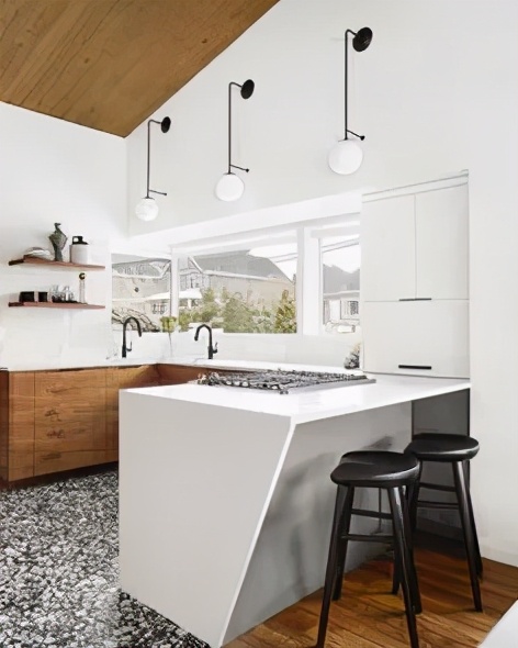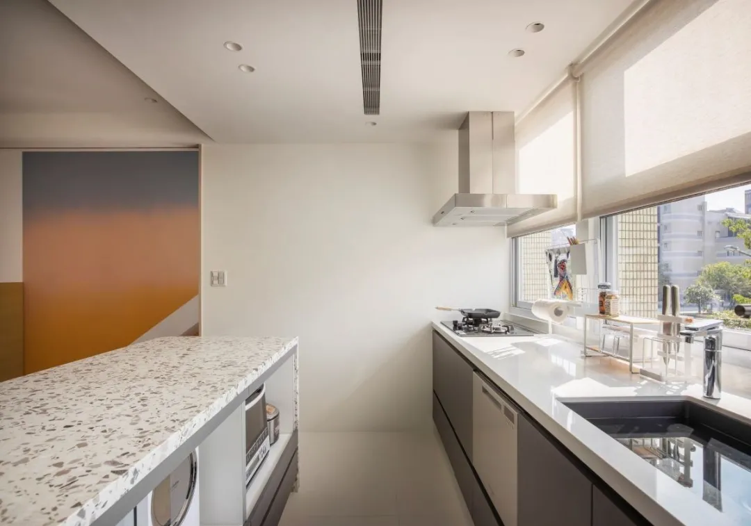 以進口水磨石打造廚房中島,豐富北歐風情。