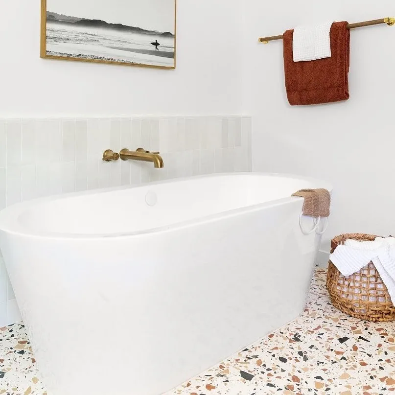 地平採用水磨石,搭配白色浴缸與素淨牆面,一樣賞心悅目。