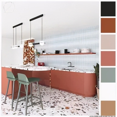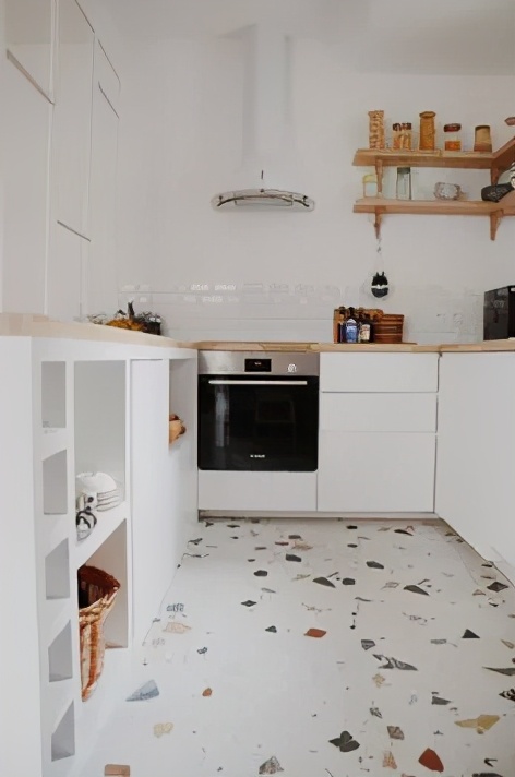 當水磨石地面運用在廚房或餐廳時,你會發現白色系、紅色系、藍色系、木色系的桌面或櫃體,都搭配得風格感十足!