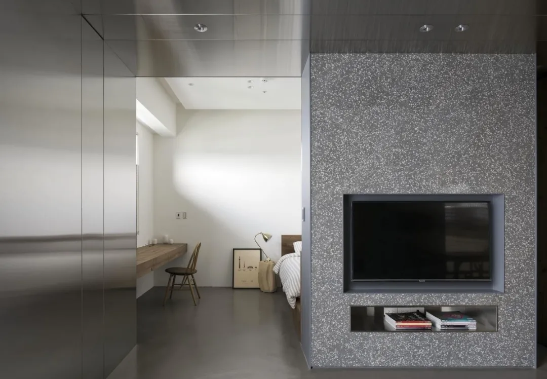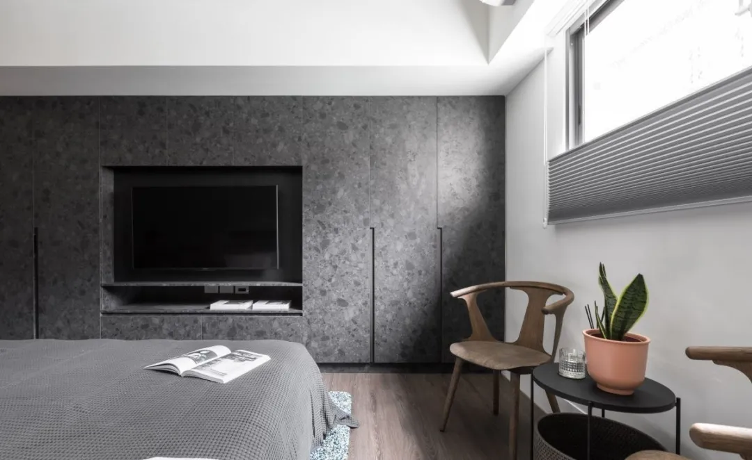 臥房運用仿水磨石花紋的人造石裝飾收納牆面,形塑輕薄又溫潤的質感。