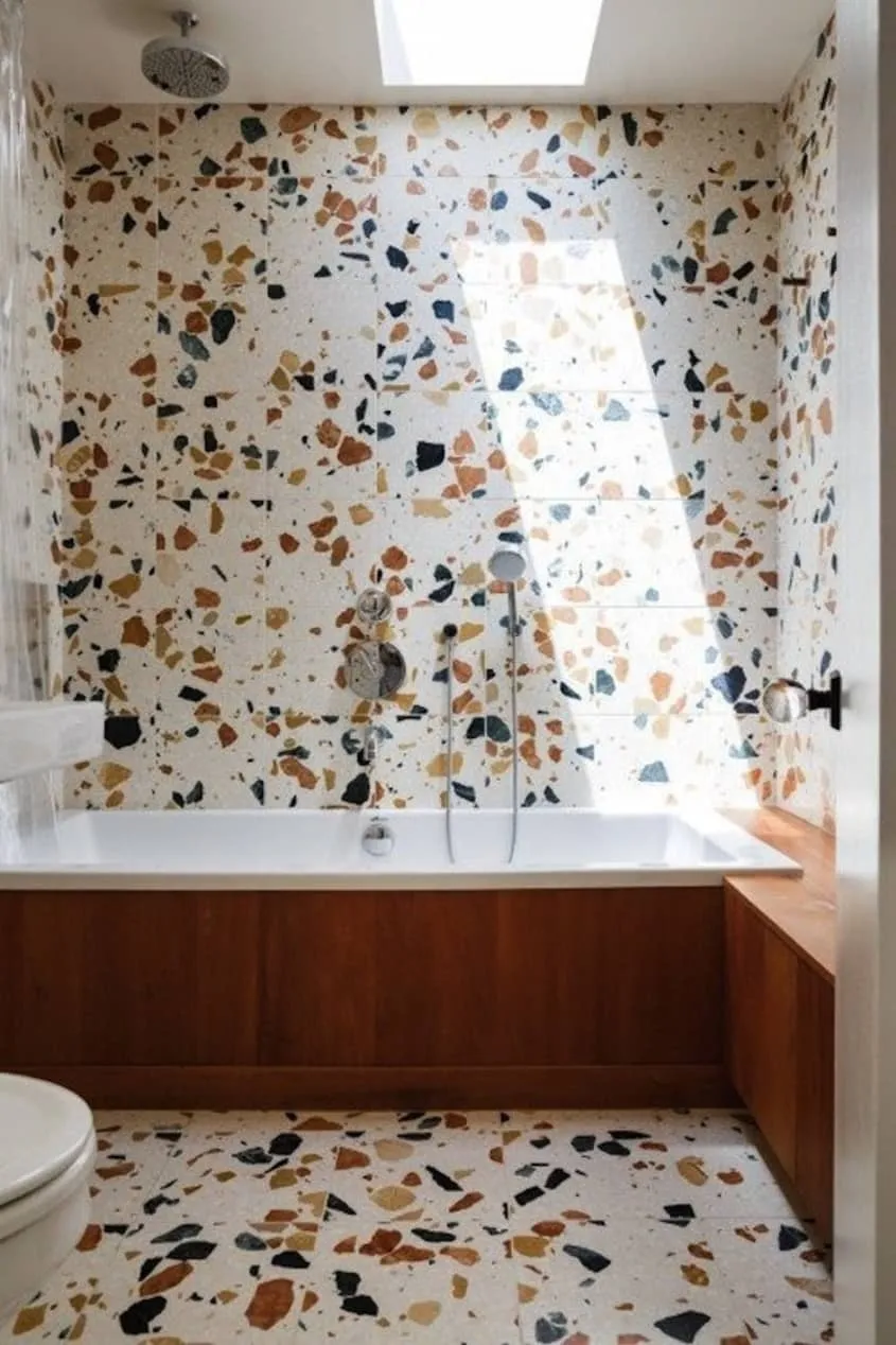 繽紛色彩的水磨石,運用在浴室的牆面與地面,整體氣氛很舒適。