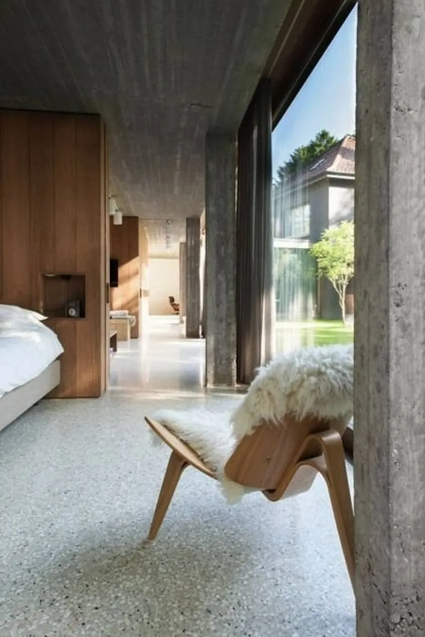 設計師在重新思考對角線形式的空間布局時,運用水磨石材質創造設計的大不同。