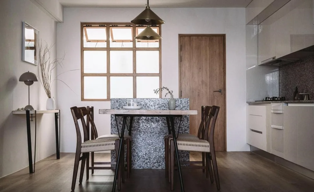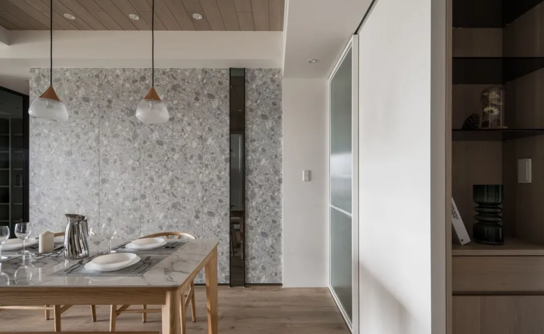 選擇淺色灰階的水磨石花紋,作為餐廳主牆也很適合。