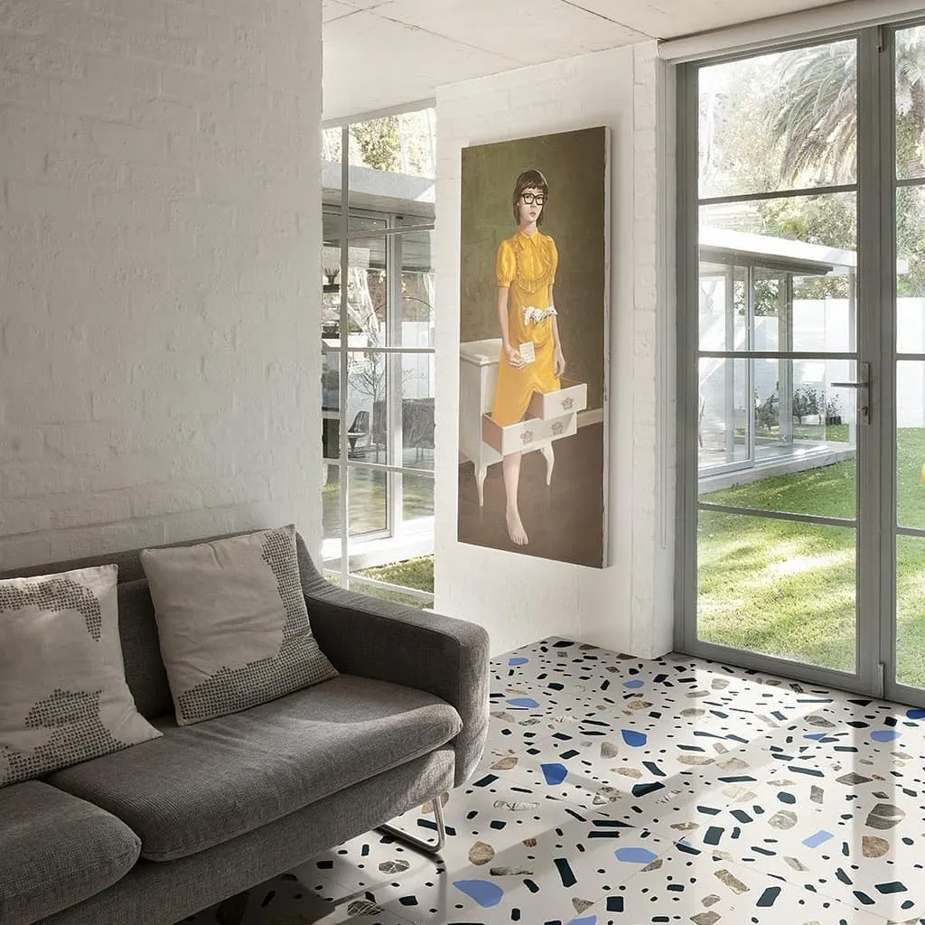 明顯看得出與臺式老屋磨石子最大的不同,在於花色更多元且石塊通常有大有小,而室內設計師也近幾年來也大量運用於地板、牆面、中島臺面甚至是廚房防濺板設計上,與臺式磨石子有完全不一樣的風味。