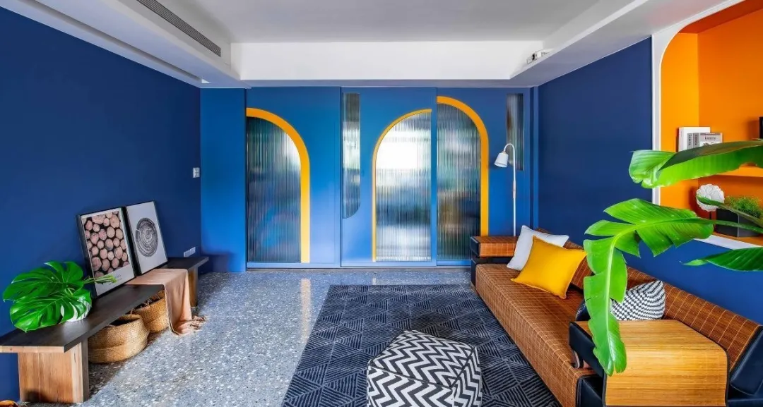 保留老屋大面積的水磨石地板,搭配造型與鮮艷塗料色彩,讓老建材接軌混搭設計。
