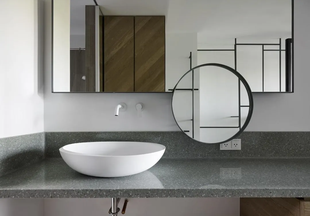 無接縫水磨石用於廁所洗手臺,好清潔也不會藏污納垢。