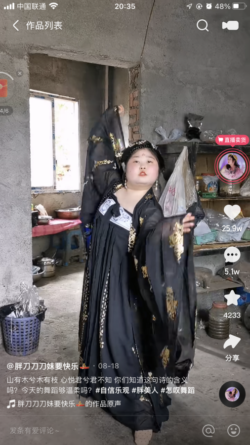刀妹火了。7月初,她又嘗試唐舞「美人行」。陋室裡,一個圓潤的女生,身著唐裝起舞。一招一式,流暢美好。