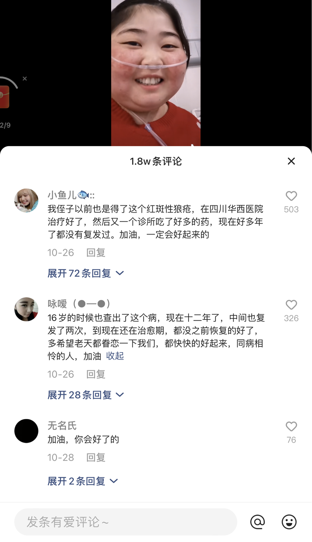 也有越來越多的紅斑狼瘡患者,在刀妹的視訊下留言,問她用的藥物,講述自己的患病生活。她的帳號,成了一個溫暖的病友小社區。