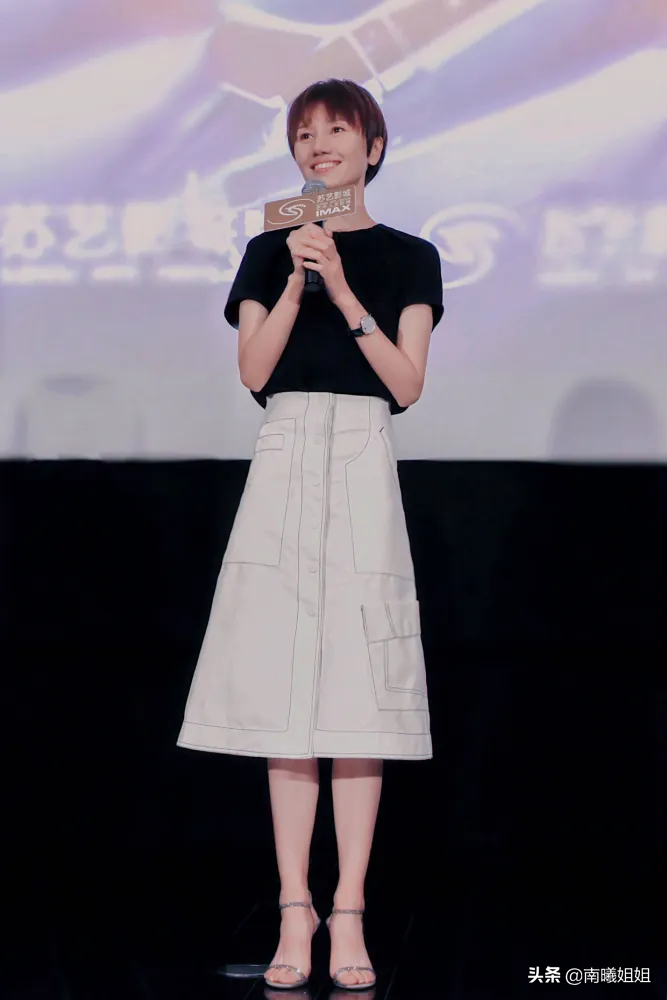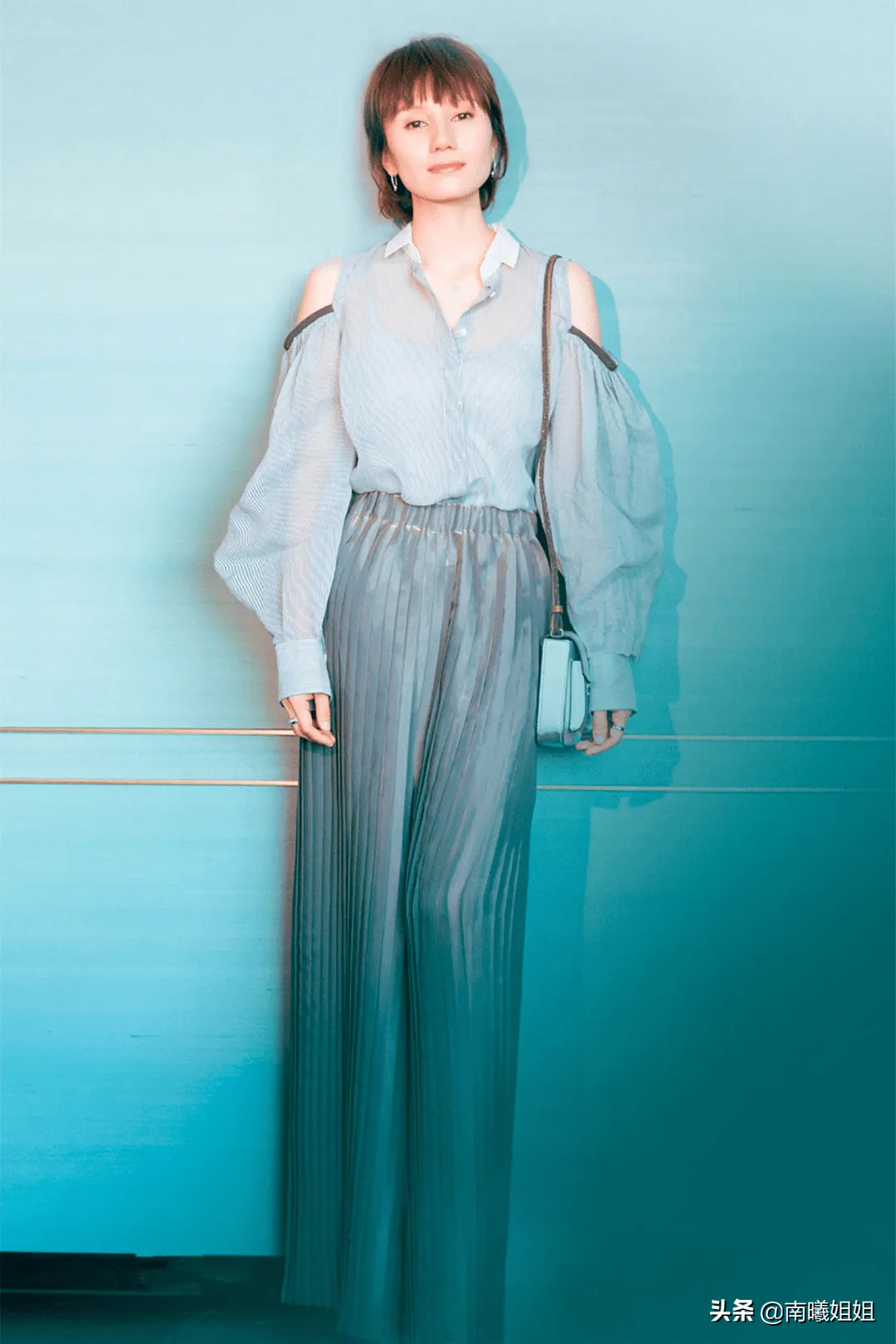 對於已到中年的袁泉而言,腿型的襯顯重點是要流暢得體好看,所以建議大家就不要搭配緊身款的下裝了,修直+流暢+略微寬鬆的褲裝或者是裙裝,更能夠襯托出來理想的筆直纖細又纖長的雙腿線條,還可以增強穿搭上的利落感,這樣的設計符合簡約氣質且修飾力強。