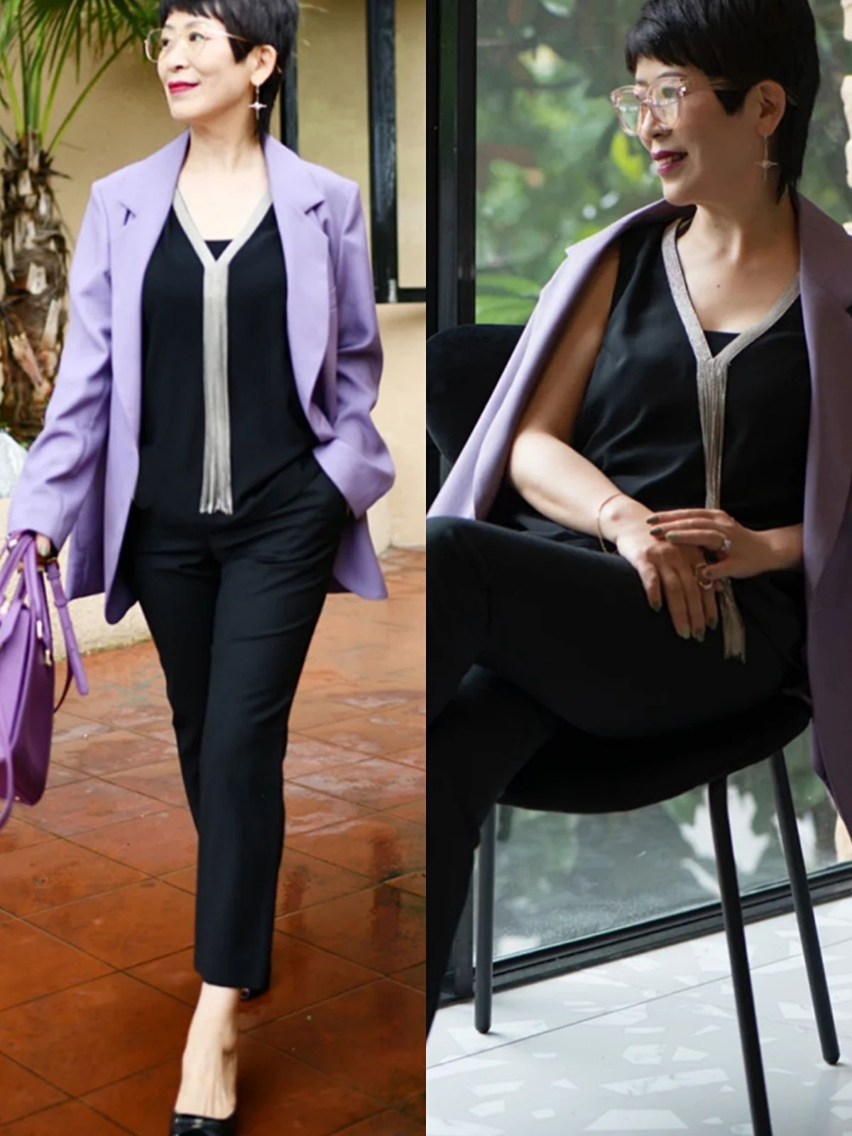 西裝作為成熟女性的經典代表單品之一,不管是通勤還是休閒穿都完全沒問題,要想避免傳統西裝帶來的沉悶感,可以加入一些亮色系來緩解,例如紫色的西裝,給人的感覺十分高級顯年輕。