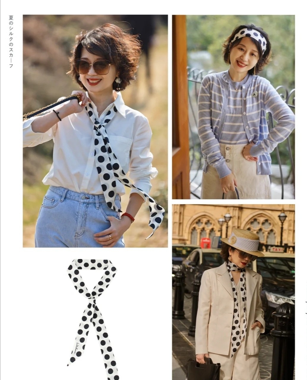 設計簡單一點的白色襯衫,應該算是女性最信賴的單品之一。外形的單調感,也是它與生俱來的不足,可以佩戴一款波點絲巾,巧妙地穿出優雅氣質。