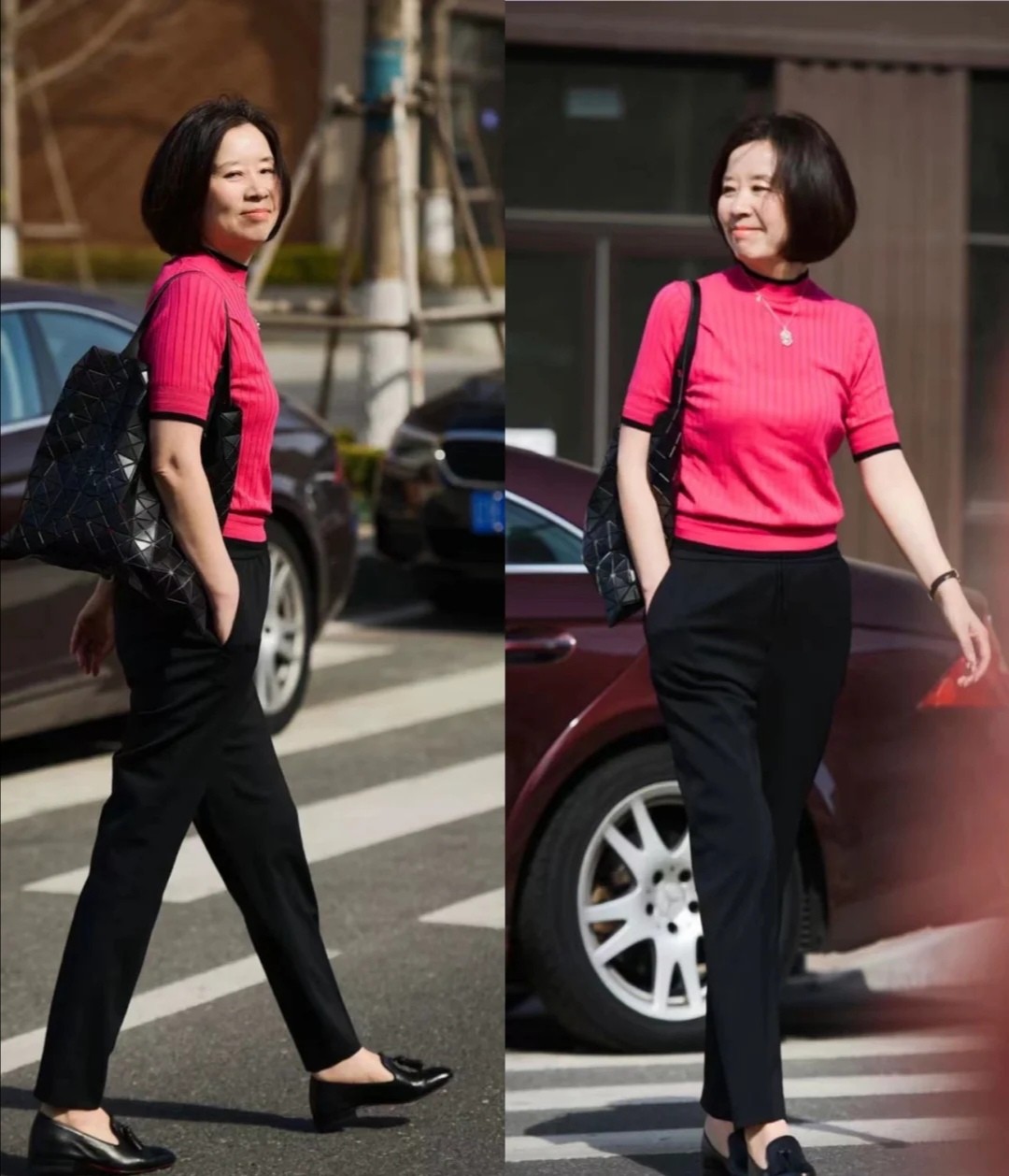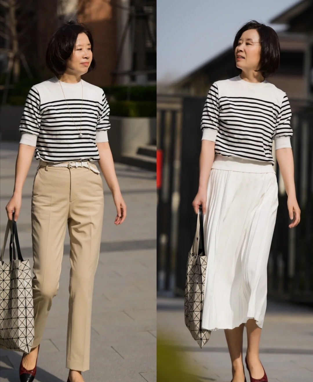 上了年紀的女性,她們逐漸地將衣櫃裡的那些不實用的服裝淘汰掉,留下來的自然都是精品,都屬於佳品。除了襯衫以及條紋衫以外,也可以運用純色針織短袖構造夏日穿搭。