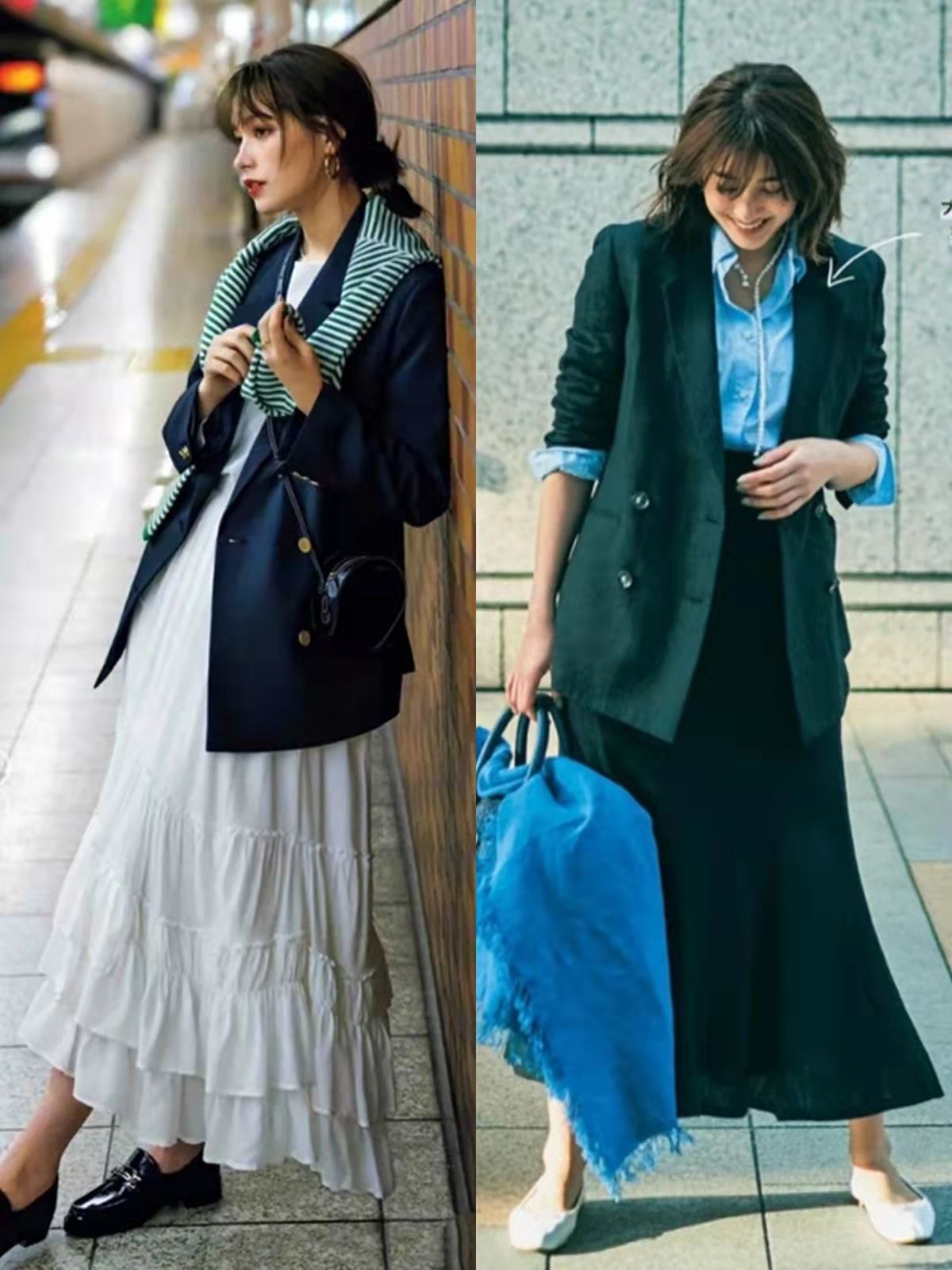 日雜中最常見的便是用西服搭配裙裝,打造甜美利落的混搭風。像藏藍色、黑色西服組合白色裙裝,甜美而輕盈。如果搭配深色系裙裝,不妨將亮點放在上半身,選擇彩色系內搭打造驚艷感。