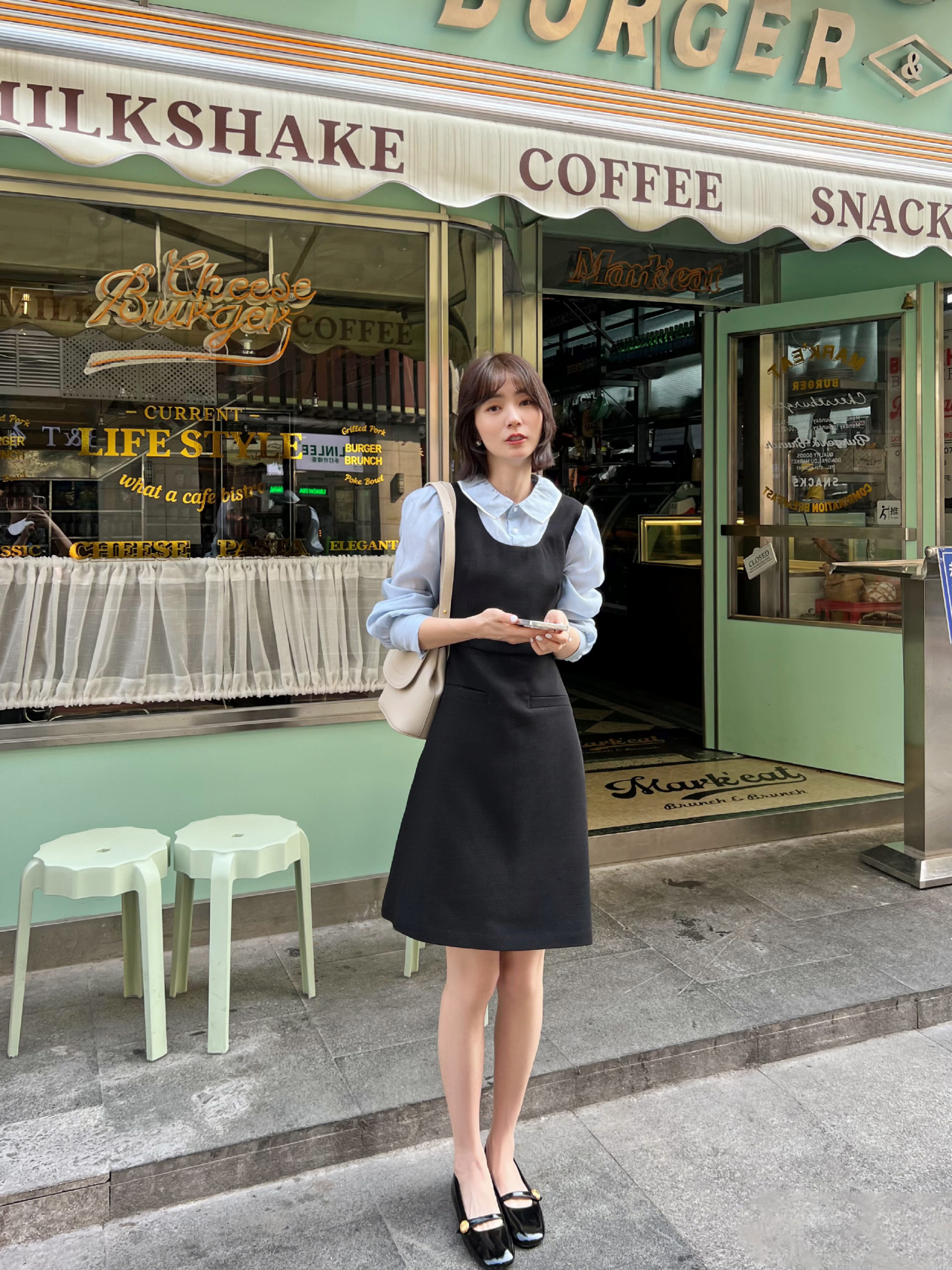 帶有泡泡袖設計的淺藍色娃娃領襯衫配上黑色背帶裙,整體搭配既顯簡約又優雅感十足,腳上的黑色亮面瑪麗珍皮鞋,也凸顯出了精緻少女的味道,配上女生的齊瀏海短髮髮型,也格外顯嫩。