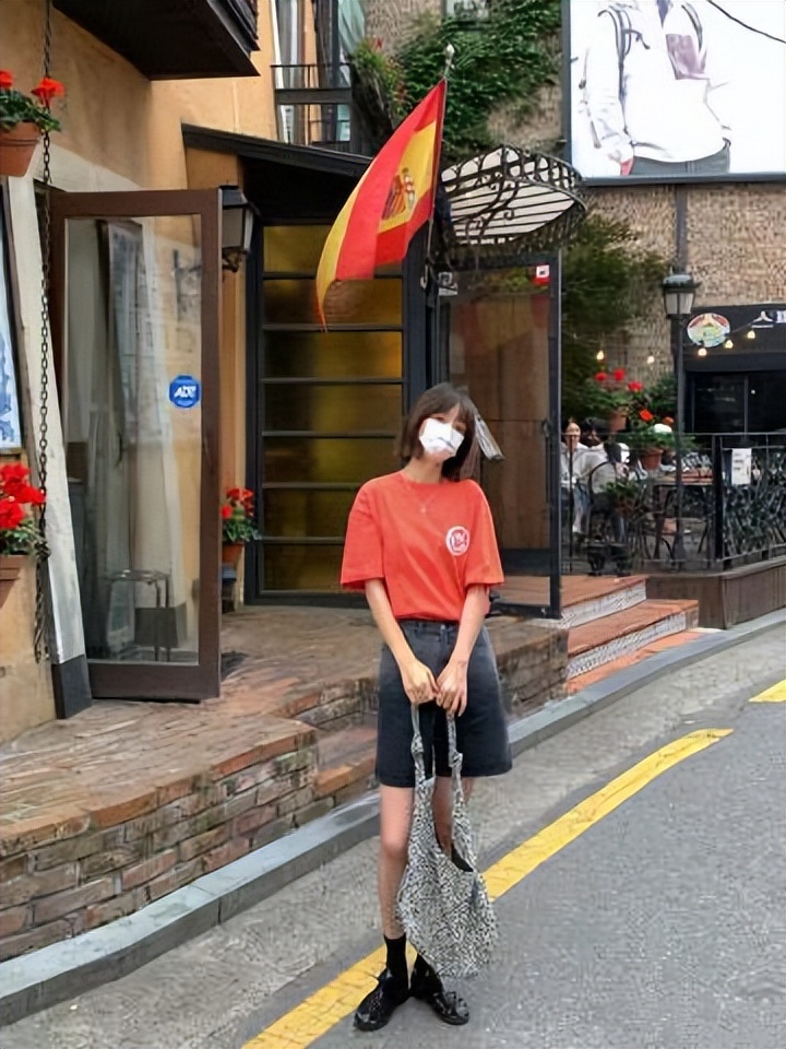 在休閒裝搭配當中也可以融入一些街頭元素,這樣看上去既顯俏皮又個性,這身橘色T恤配上黑灰色五分牛仔短褲的造型,時髦又有個性,搭配上女生的短髮髮型,很是清爽。