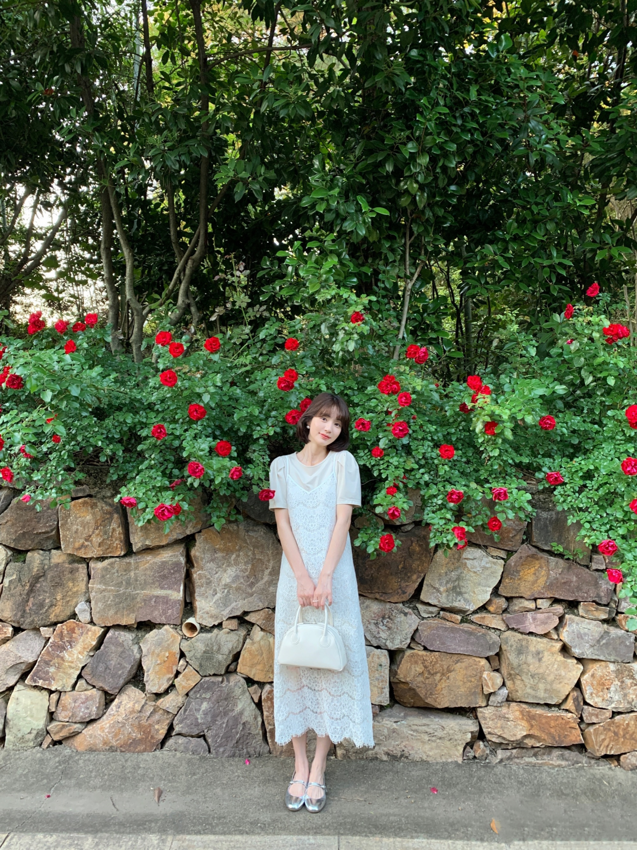 帶有蕾絲花紋設計的白色鏤空吊帶連衣裙,裙擺呈現出a字形狀,可以較好的遮擋跨寬腿粗的問題,配上內搭的白色寬鬆T恤,休閒又有女生味。