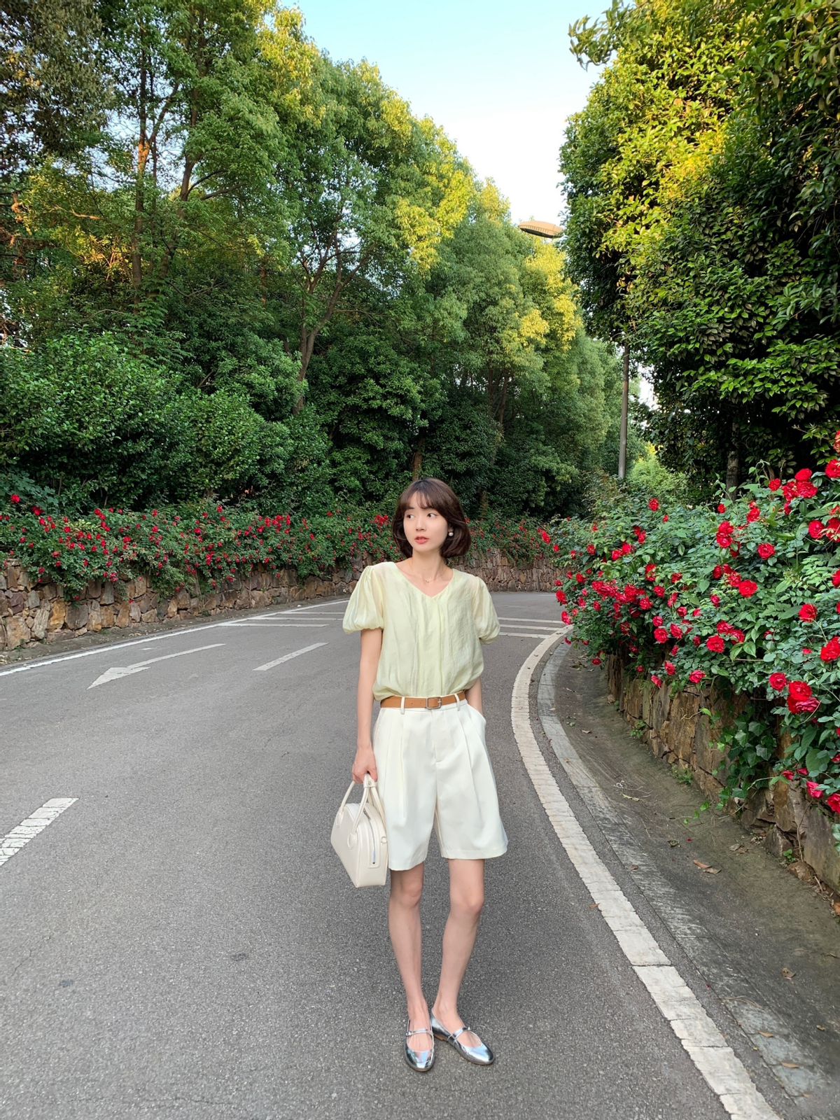 女性到了三十歲之後,偶爾也可以穿的,少女又有個性一些,這身暖黃色泡泡袖上衣配上白色西裝五分褲的造型,個性又顯清純,腰間的黃色腰帶很好的分割的身材比例,顯現出一雙大長腿。