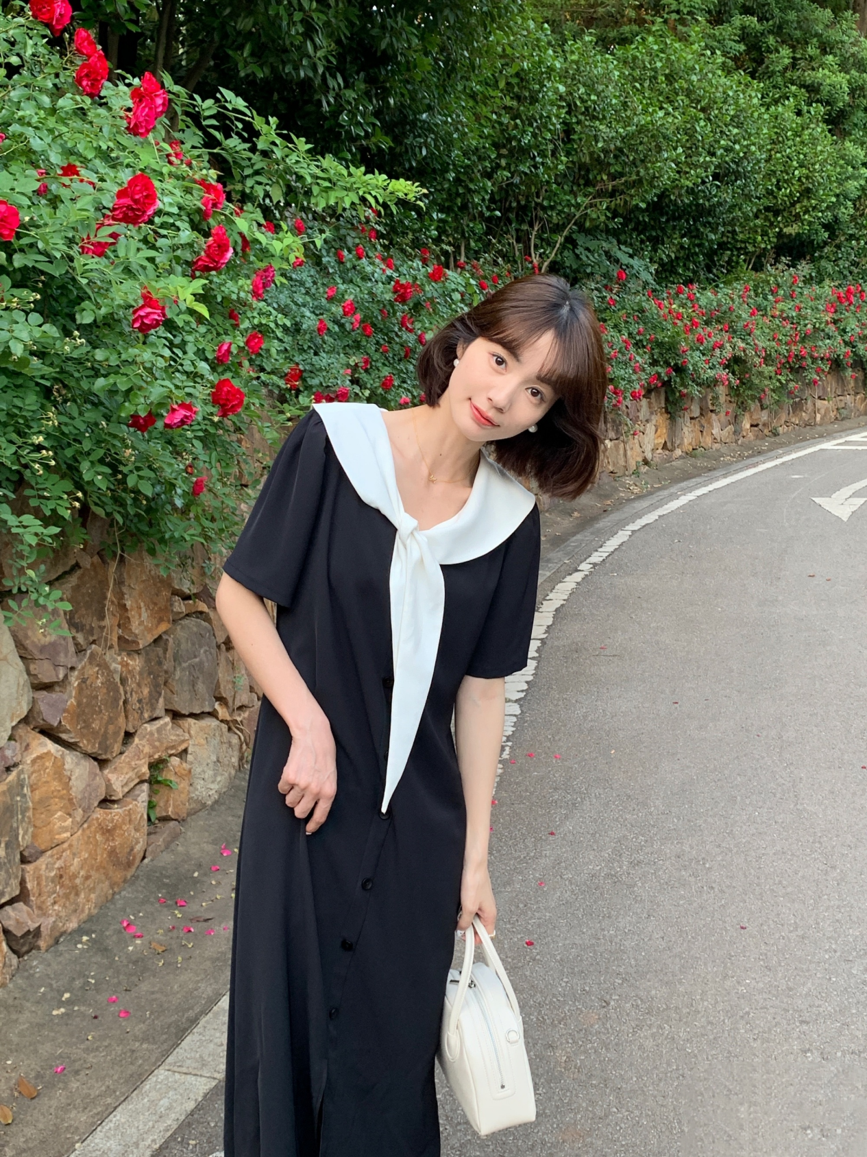 寬鬆的黑色連衣裙,既可以遮肉又非常顯瘦,搭配上領口的白色領巾設計,清爽又顯少女。