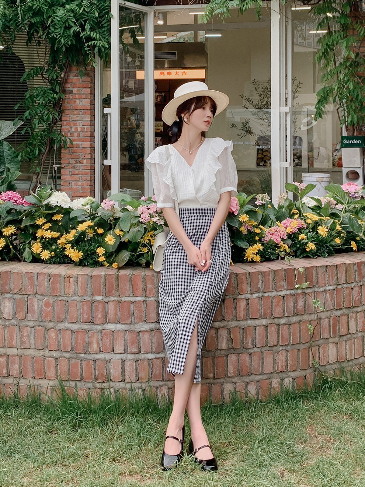 三四十歲的女性想要選擇一些減齡搭配,建議在搭配當中融入一些少女元素,這樣看上去既不誇張,也能帶來一絲甜美氣息,像這款白色法式雪紡衫,領口部分的荷葉邊設計很好的凸顯出了甜美味道,配上黑色亮面瑪麗珍皮鞋以及黑白格紋開叉直筒裙,優雅又精緻。