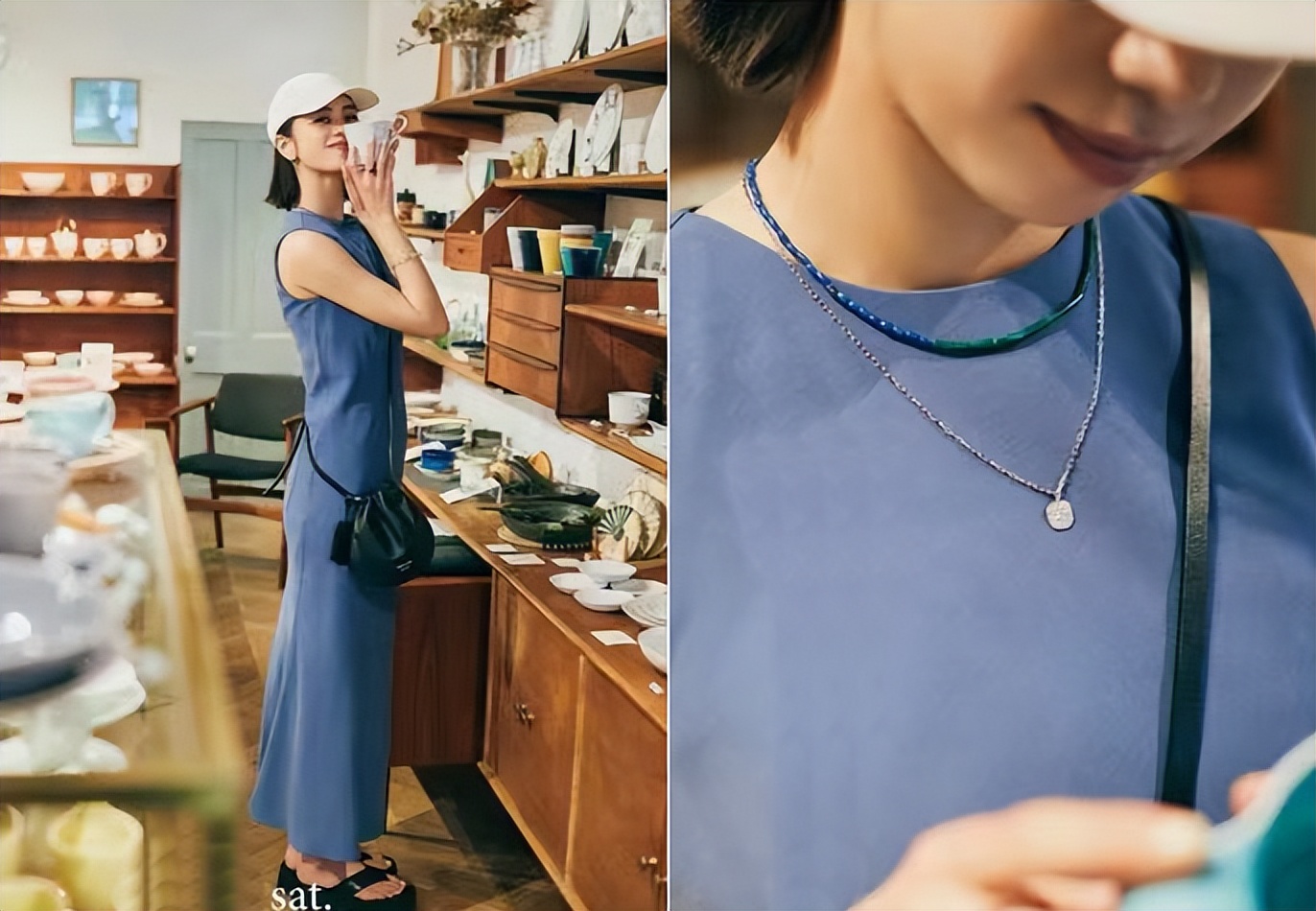 長裙,簡單無亮點,最容易出賣身材。引用精緻飾品,聚焦頸部焦點,實用且巧妙。小巧的飾品,清雅有美感,與這份嫻淑一拍即合。