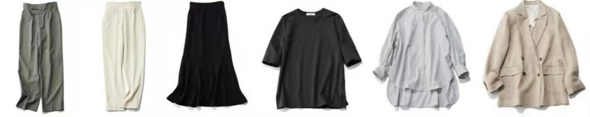 例如,這次用到的6件春天基本款單品如下:軍綠色長褲、小白褲、黑色半身裙、黑色T恤、灰色襯衫、米色西裝。
