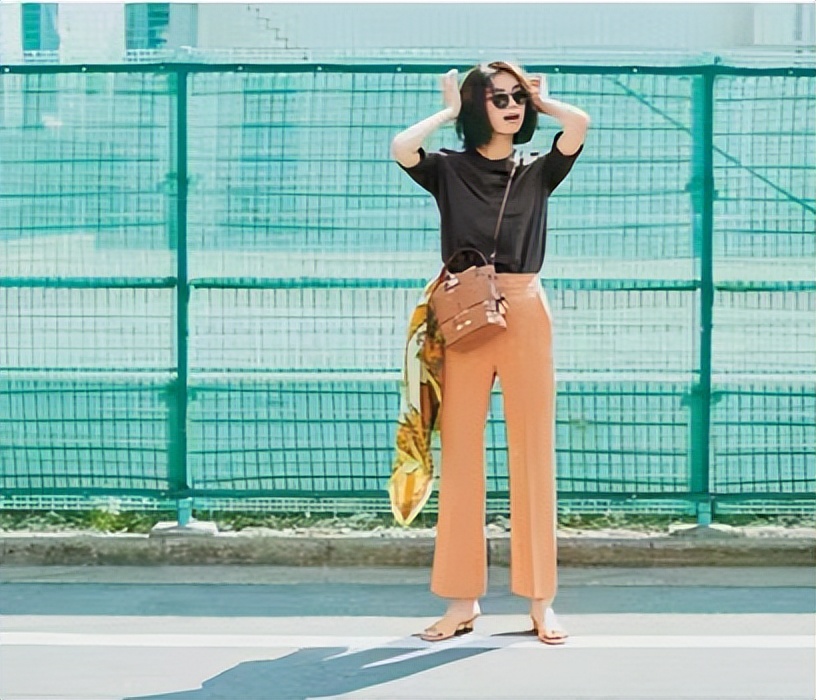 例如,黑色與粉橙色。一沉穩、一鮮艷,混搭得風生水起。這件黑色T恤,應該是絲棉面料,精緻感與女生味,難能可貴。