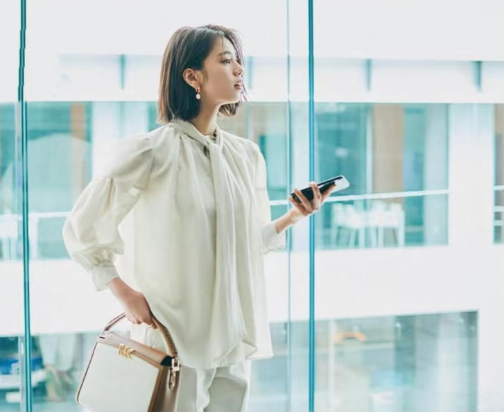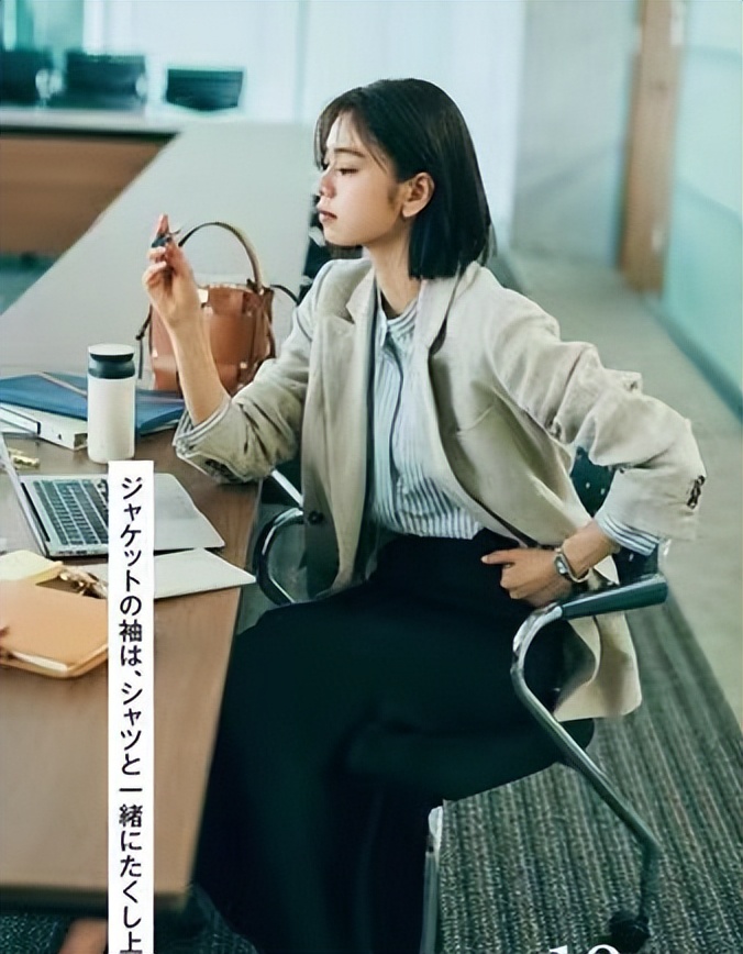 像這次的場景,大多是職場。中性+女生味的混搭,運用得最多。例如,米色西裝搭配小白褲,一雙尖頭單鞋,就是精緻調和。