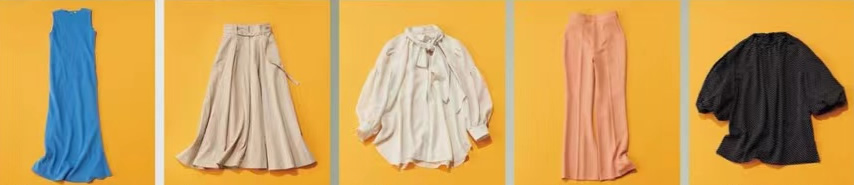 5件時髦季節單品如下:藍色長裙、米色傘裙、華麗風襯衫、小粉褲、黑色波點上衣