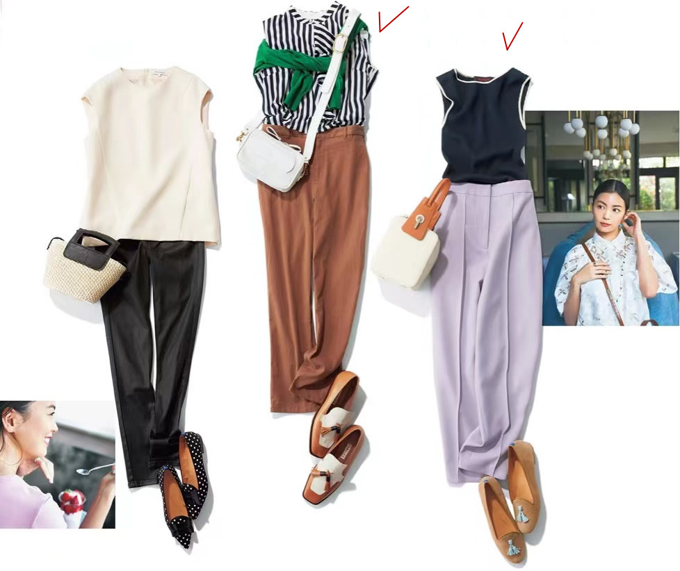 對比下圖3套搭配,條紋衫與黑白撞色上衣的個性十足,立體感比較強。反之,米白上衣偏保守,顯得中規中矩。