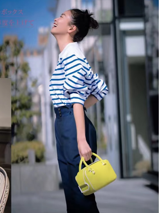 條紋衫的活力熱情,算是基本款裡的另類。氣勢橫條紋強化,自有一番敢做敢當。用明媚黃色包包點綴,適度分擔壓力,帥氣之餘不失嫵媚。
