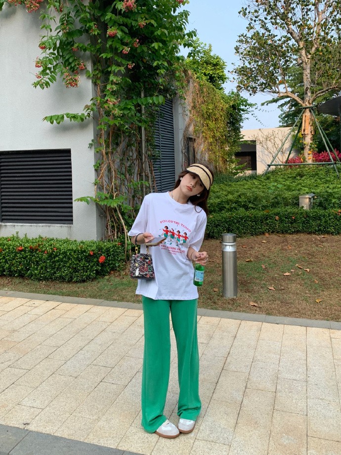因為這件T恤比比較修身,所以博主在下半身搭配著寬鬆的闊腿褲,形成了松緊結合的效果,看上去就更有利於顯瘦。高腰闊腿褲的搭配還能夠直接拉伸她的雙腿,小個子必入。