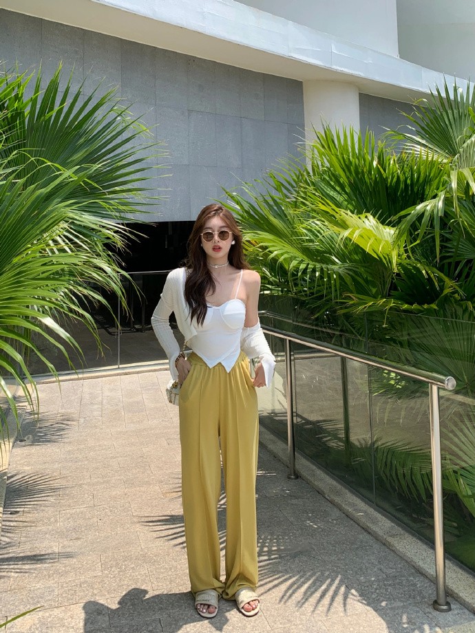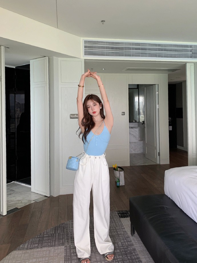 下半身可以去嘗試用這種稍微寬鬆一些的闊腿褲,用白色闊腿褲搭配上藍色的吊帶,松緊結合的方式能夠幫我們修飾身材,高腰闊腿褲的搭配也能夠拉伸雙腿,小個子可以學起來。