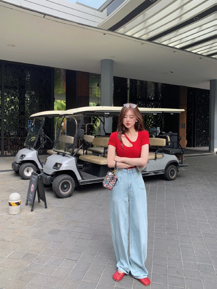 推薦大家在夏天可以多嘗試流行色穿搭,別總是穿一身黑,看上去容易顯出單調感,像這些潮人們通過這種紅色的T恤凹造型,彰顯出了滿滿的活力,看著青春又吸睛,這種紅色的T恤胸前結合了不規則的剪裁,也能夠展現出穿著者的時尚感,看上去顯瘦效果也是不錯的。