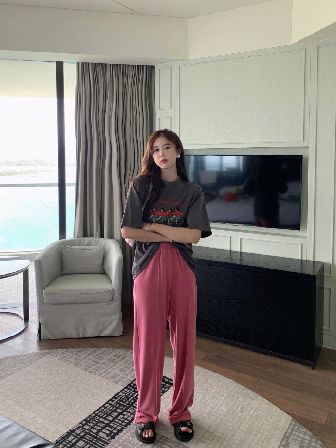 在夏天穿闊腿褲,你可以多嘗試一些不同的色彩,除了黑白色闊腿褲,像這種玫紅色的褲子也是非常時尚的,這種亮麗的色彩穿在身上會顯得整個人活力滿滿,而且這種彩色褲裝的搭配非常有利於減齡,配上T恤之後也會顯得很清爽。